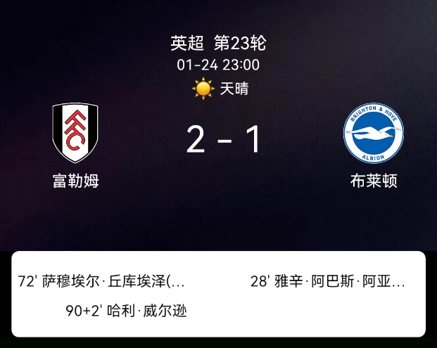 北京时间1月24日,英格兰足球超级联赛第23轮,富勒姆主场对阵布莱顿。第28分钟阿亚里破门0-1;第73分钟丘库埃泽破门1-1;补时2分钟哈里-威尔逊破门2-1;双方无红黄牌。最终比分,富勒姆2-1布莱顿。