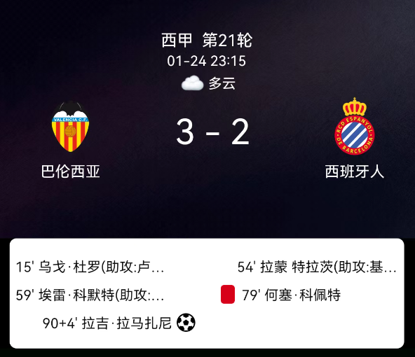 北京时间1月24日,西班牙足球甲级联赛第21轮,瓦伦西亚主场对阵西班牙人。第15分钟杜罗破门1-0;第54分钟特拉茨破门1-1;第59分钟居马尔特破门2-1;第79分钟科佩特乌龙2-2;补时4分钟拉马扎尼点射3-2;双方无红黄牌。最终比分,瓦伦西亚3-2西班牙人。