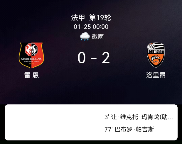 北京时间1月25日,法国足球顶级联赛第19轮,雷恩主场对阵洛里昂。第3分钟马肯戈破门0-1;第77分钟帕吉破门0-2;双方无红黄牌。最终比分,雷恩0-2洛里昂。