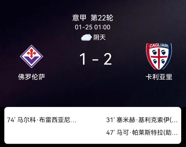 北京时间1月25日,意大利足球甲级联赛第22轮,佛罗伦萨主场对阵卡利亚里。第31分钟克勒奇索伊破门0-1;第47分钟帕莱斯特拉破门0-2;第74分钟布雷夏尼尼破门1-2;双方无红黄牌。最终比分,佛罗伦萨1-2卡利亚里。