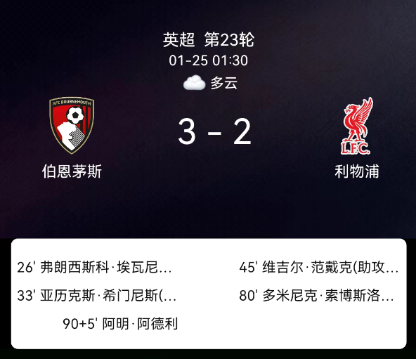 北京时间1月25日,英格兰足球超级联赛第23轮,伯恩茅斯主场对阵利物浦。第26分钟埃万尼尔松破门1-0;第33分钟希门尼斯破门2-0;第45分钟范戴克破门2-1;第80分钟索博斯洛伊破门2-2;补时5分钟阿德利破门3-2;双方无红黄牌。最终比分,伯恩茅斯3-2利物浦。