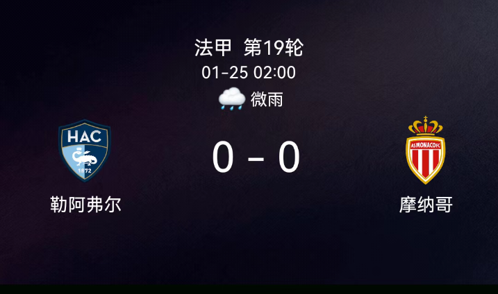 北京时间1月25日,法国足球甲级联赛第19轮,勒阿弗尔主场对阵摩纳哥。全场无进球,双方无红黄牌。最终比分,勒阿弗尔0-0摩纳哥。