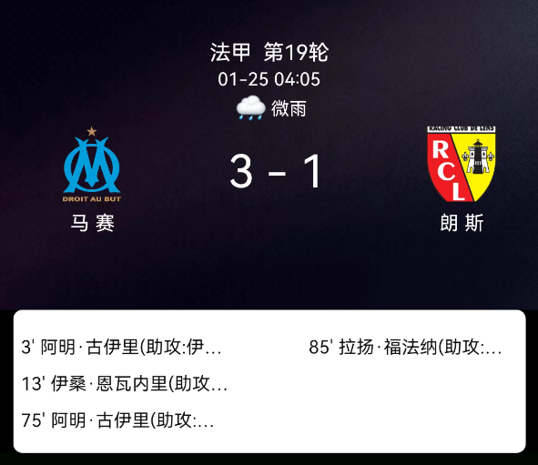 北京时间1月25日,法国足球顶级联赛第19轮,马赛主场对阵朗斯。第3分钟古伊里破门1-0;第13分钟恩瓦内里破门2-0;第75分钟古伊里破门3-0;第85分钟福法纳破门3-1;双方无红黄牌。最终比分,马赛3-1朗斯。
