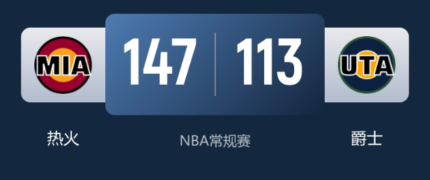 1月25日消息,NBA常规赛爵士主场迎战热火,热火次节发力建立巨大优势,最终147-116大胜爵士,爵士努尔基奇达成连续3场三双仍难救主。