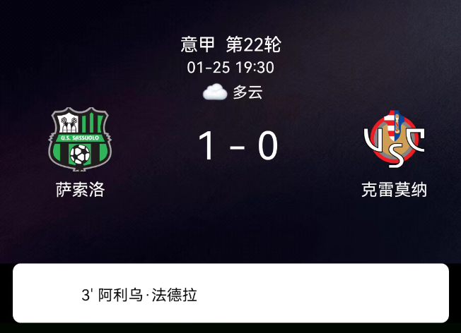 北京时间1月25日,意大利足球甲级联赛第22轮,萨索洛主场对阵克雷莫内塞。第3分钟法代拉破门1-0;双方无红黄牌。最终比分,萨索洛1-0克雷莫内塞。