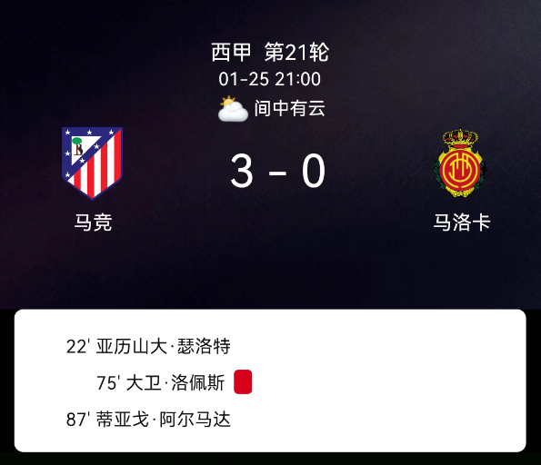 北京时间1月25日,西班牙足球甲级联赛第21轮,马德里竞技主场对阵马略卡。第22分钟瑟洛特破门1-0;第75分钟洛佩斯乌龙2-0;第87分钟阿尔马达破门3-0;希门尼斯、洛佩斯染黄无红牌。最终比分,马德里竞技3-0马略卡。
