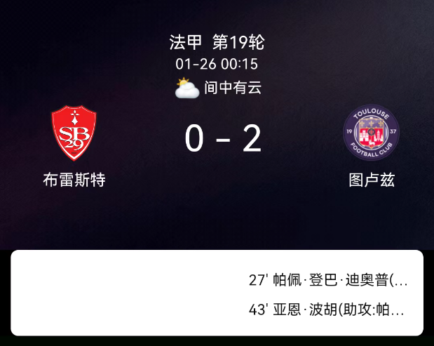 北京时间1月26日,法国足球顶级联赛第19轮,布雷斯特主场对阵图卢兹。第27分钟迪奥普破门0-1;第43分钟格博霍破门0-2;双方无红黄牌。最终比分,布雷斯特0-2图卢兹。