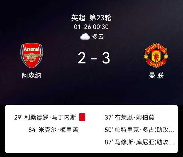 北京时间1月26日,英格兰足球超级联赛第23轮,阿森纳主场对阵曼联。第29分钟利马乌龙1-0;第36分钟姆伯莫破门1-1;第50分钟多古破门1-2;第84分钟梅里诺破门2-2;第87分钟库尼亚破门2-3;赖斯、埃泽染黄无红牌。最终比分,阿森纳2-3曼联。