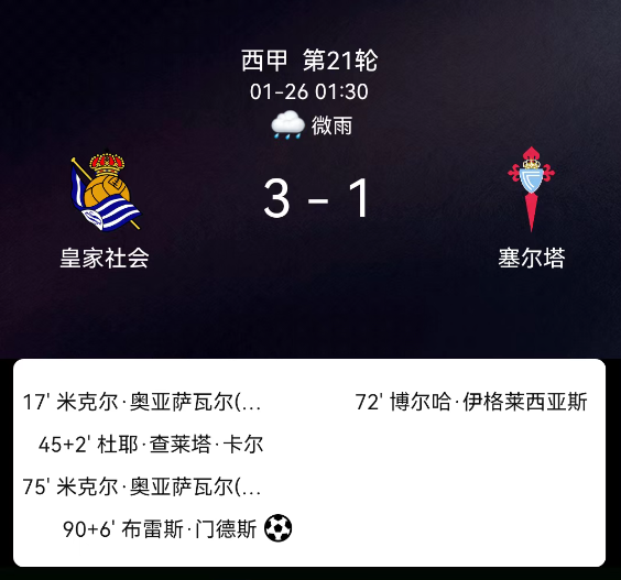 北京时间1月26日,西班牙足球甲级联赛第21轮,皇家社会主场对阵塞尔塔。第17分钟奥亚萨瓦尔破门1-0;补时2分钟卡莱塔-卡尔红牌;第72分钟伊格莱西亚斯破门1-1;第75分钟奥亚萨瓦尔破门2-1;补时6分钟门德斯点射3-1。最终比分,皇家社会3-1塞尔塔。