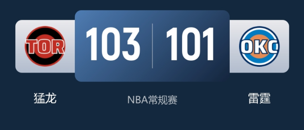 1月26日消息,NBA常规赛猛龙迎战雷霆,猛龙末节关键攻防定胜局,103-101险胜对手豪取4连胜,送雷霆赛季第10败。
