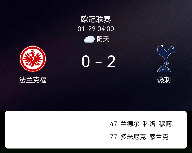 北京时间1月29日,欧冠联赛阶段第8轮,法兰克福主场对阵托特纳姆热刺。第47分钟穆阿尼破门0-1;第78分钟索兰克破门0-2;双方无红黄牌。最终比分,法兰克福0-2托特纳姆热刺。