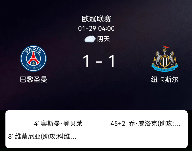 北京时间1月29日,欧冠联赛阶段第8轮,巴黎圣日耳曼主场对阵纽卡斯尔联。第8分钟维蒂尼亚破门1-0;补时2分钟威洛克破门1-1;双方无红黄牌。最终比分,巴黎圣日耳曼1-1纽卡斯尔联。