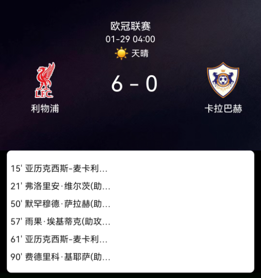 北京时间1月29日,欧冠联赛阶段第8轮,利物浦主场对阵卡拉巴赫。第15分钟麦卡利斯特破门1-0;第21分钟维尔茨破门2-0;第50分钟萨拉赫破门3-0;第57分钟埃基蒂克破门4-0;第62分钟麦卡利斯特破门5-0;第90分钟小基耶萨破门6-0;双方无红黄牌。最终比分,利物浦6-0卡拉巴赫。