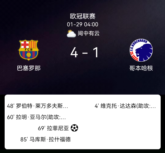 北京时间1月29日,欧冠联赛阶段第8轮,巴塞罗那主场对阵哥本哈根。第5分钟达达松破门0-1;第49分钟莱万破门1-1;第60分钟亚马尔破门2-1;第69分钟拉菲尼亚点射3-1;第85分钟拉什福德破门4-1;双方无红黄牌。最终比分,巴塞罗那4-1哥本哈根。