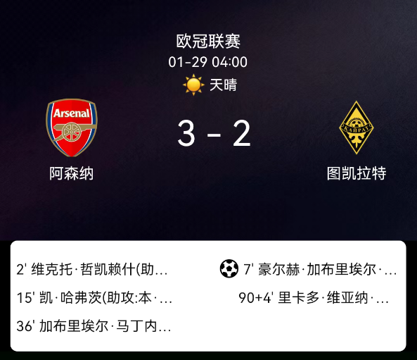 北京时间1月29日,欧冠联赛阶段第8轮,阿森纳主场对阵阿拉木图凯拉特。第2分钟哲凯赖什破门1-0;第6分钟若日尼奥点射1-1;第16分钟哈弗茨破门2-1;第36分钟马丁内利破门3-1;补时4分钟里卡迪尼奥破门3-2;若日尼奥染黄。最终比分,阿森纳3-2阿拉木图凯拉特。