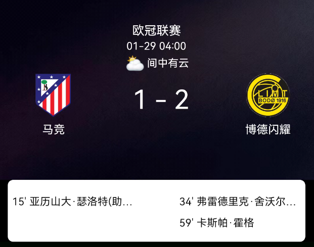 北京时间1月29日,欧冠联赛阶段第8轮,马德里竞技主场对阵博德闪耀。第15分钟瑟洛特破门1-0;第34分钟舍沃尔德破门1-1;第59分钟卡斯帕-霍破门1-2;双方无红黄牌。最终比分,马德里竞技1-2博德闪耀。