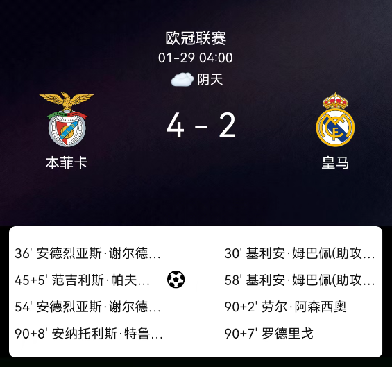 北京时间1月29日,欧冠联赛阶段第8轮,本菲卡主场对阵皇家马德里。第3分钟楚阿梅尼染黄;第30分钟姆巴佩破门1-1;第36分钟谢尔德鲁普破门1-2;补时6分钟帕夫利季斯点射1-3;第54分钟谢尔德鲁普破门1-4;第58分钟姆巴佩破门2-4;补时5分钟阿森西奥两黄变一红;补时7分钟罗德里戈直红;补时8分钟特鲁宾破门2-5。最终比分,皇家马德里2-5本菲卡。