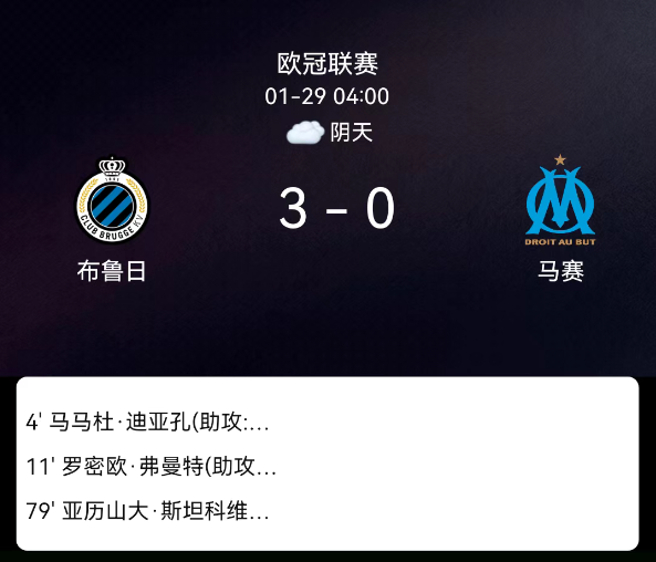 北京时间1月29日,欧冠联赛阶段第8轮,布鲁日主场对阵马赛。第4分钟贾孔破门1-0;第11分钟弗尔芒破门2-0;第79分钟斯坦科维奇破门3-0;双方无红黄牌。最终比分,布鲁日3-0马赛。