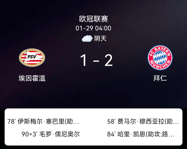 北京时间1月29日,欧冠联赛阶段第8轮,PSV埃因霍温主场对阵拜仁慕尼黑。第24分钟于帕梅卡诺染黄;第57分钟穆西亚拉破门0-1;第78分钟萨伊瓦里破门1-1;第84分钟凯恩破门1-2。最终比分,PSV埃因霍温1-2拜仁慕尼黑。