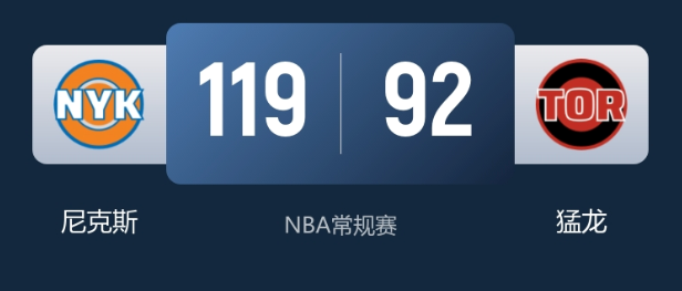 1月29日消息,NBA常规赛尼克斯对阵猛龙,尼克斯第三节打出制胜攻势实现反超,119-92力克猛龙豪取4连胜,终结对手4连胜。