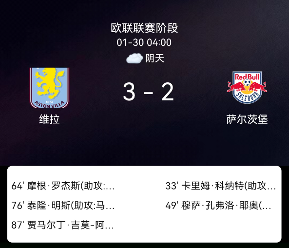 北京时间1月30日,欧足联欧洲联赛阶段第8轮,阿斯顿维拉主场对阵萨尔茨堡红牛。第33分钟科纳特破门0-1;第48分钟穆萨破门0-2;第64分钟罗杰斯破门1-2;第76分钟明斯破门2-2;第87分钟阿洛巴破门3-2;双方无红黄牌。最终比分,阿斯顿维拉3-2萨尔茨堡红牛。