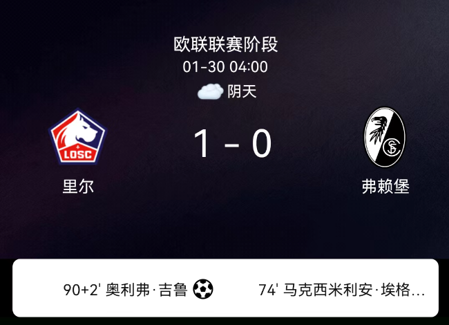 北京时间1月30日,欧足联欧洲联赛阶段第8轮,里尔主场对阵弗赖堡。第74分钟埃格施泰因直红;补时2分钟吉鲁点射1-0;无其他牌罚。最终比分,里尔1-0弗赖堡。