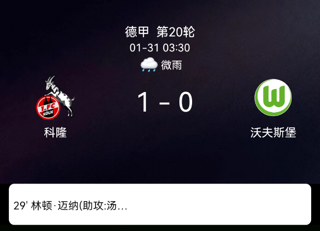 北京时间1月31日,德国足球顶级联赛第20轮,科隆主场对阵沃尔夫斯堡。第29分钟马伊纳破门1-0;双方无红黄牌。最终比分,科隆1-0沃尔夫斯堡。