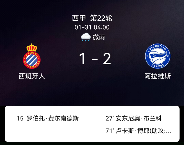 北京时间1月31日,西班牙足球甲级联赛第22轮,西班牙人主场对阵阿拉维斯。第15分钟费尔南德斯破门1-0;第27分钟布兰科破门1-1;第71分钟卢卡斯-博耶破门1-2;双方无红黄牌。最终比分,西班牙人1-2阿拉维斯。