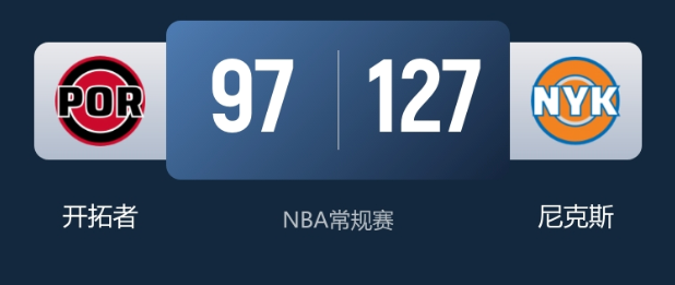 NBA常规赛战报:尼克斯三人20+大胜开拓者杨瀚森末节登场4分钟