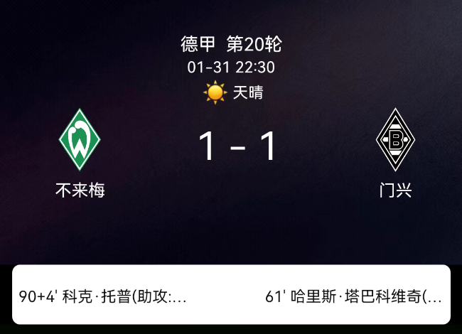 北京时间1月31日,德国足球顶级联赛第20轮,云达不莱梅主场对阵门兴格拉德巴赫。第61分钟塔巴科维奇破门0-1;补时4分钟科克-托普破门1-1;双方无红黄牌。最终比分,云达不莱梅1-1门兴格拉德巴赫。
