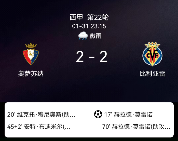 北京时间1月31日,西班牙足球甲级联赛第22轮,奥萨苏纳主场对阵比利亚雷亚尔。第17分钟赫拉德-莫雷诺点射0-1;第20分钟穆尼奥斯破门1-1;补时2分钟布季米尔破门2-1;第70分钟赫拉德-莫雷诺破门2-2;双方无红黄牌。最终比分,奥萨苏纳2-2比利亚雷亚尔。