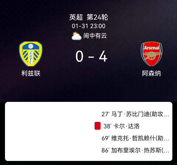 北京时间1月31日,英格兰足球顶级联赛第24轮,利兹联主场对阵阿森纳。第27分钟苏比门迪破门0-1;第38分钟达洛乌龙0-2;第69分钟哲凯赖什破门0-3;第86分钟热苏斯破门0-4;双方无红黄牌。最终比分,利兹联0-4阿森纳。