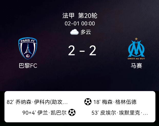 北京时间2月1日,法国足球顶级联赛第20轮,巴黎FC主场对阵马赛。第19分钟格林伍德点射0-1;第53分钟奥巴梅扬破门0-2;第82分钟伊科内破门1-2;补时4分钟凯巴尔点射2-2;双方无红黄牌。最终比分,巴黎FC2-2马赛。