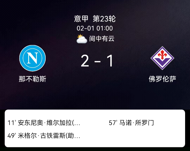 北京时间2月1日,意大利足球顶级联赛第23轮,那不勒斯主场对阵佛罗伦萨。第11分钟韦尔加拉破门1-0;第49分钟古铁雷斯破门2-0;第58分钟所罗门破门2-1;双方无红黄牌。最终比分,那不勒斯2-1佛罗伦萨。