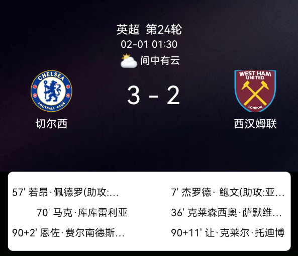 北京时间2月1日,英格兰足球顶级联赛第24轮,切尔西主场对阵西汉姆联。第7分钟鲍恩破门0-1;第36分钟萨默维尔破门0-2;第57分钟佩德罗破门1-2;第70分钟库库雷利亚破门2-2;补时2分钟恩佐破门3-2;补时11分钟托迪博红牌。最终比分,切尔西3-2西汉姆联。