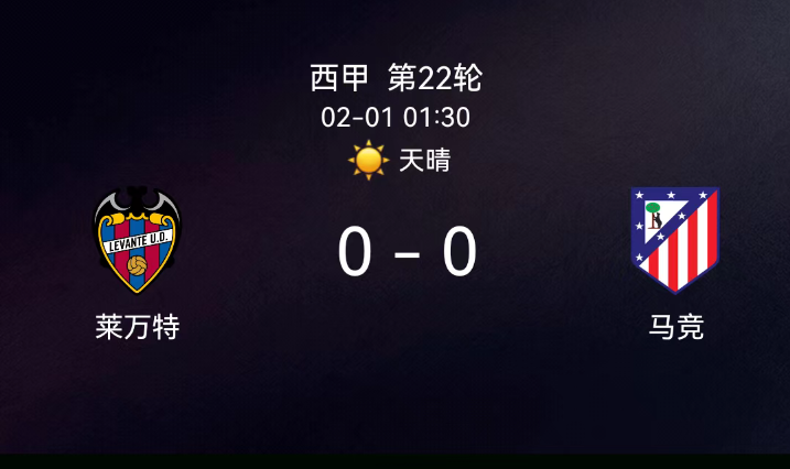 北京时间2月1日,西班牙足球甲级联赛第22轮,莱万特主场对阵马德里竞技。全场无进球,双方无红黄牌。最终比分,莱万特0-0马德里竞技。