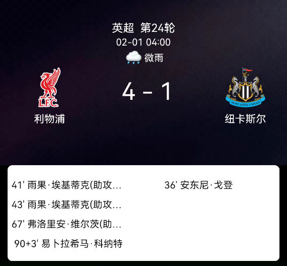 北京时间2月1日,英格兰足球顶级联赛第24轮,利物浦主场对阵纽卡斯尔联。第36分钟戈登破门0-1;第41分钟埃基蒂克破门1-1;第43分钟埃基蒂克破门2-1;第67分钟维尔茨破门3-1;补时3分钟科纳特破门4-1;第12分钟戈登黄牌。最终比分,利物浦4-1纽卡斯尔联。