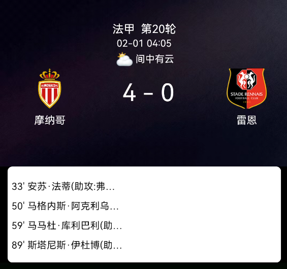 北京时间2月1日,法国足球顶级联赛第20轮,摩纳哥主场对阵雷恩。第33分钟法蒂破门1-0;第50分钟阿克利乌什破门2-0;第59分钟库利巴利破门3-0;第90分钟穆赞博破门4-0;双方无红黄牌。最终比分,摩纳哥4-0雷恩。
