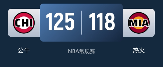 2月1日NBA常规赛公牛对阵热火,公牛多名主力缺阵,末节关键时刻发力,最终125-118力克热火,完成复仇并终结3连败,热火则遭遇客场落败。