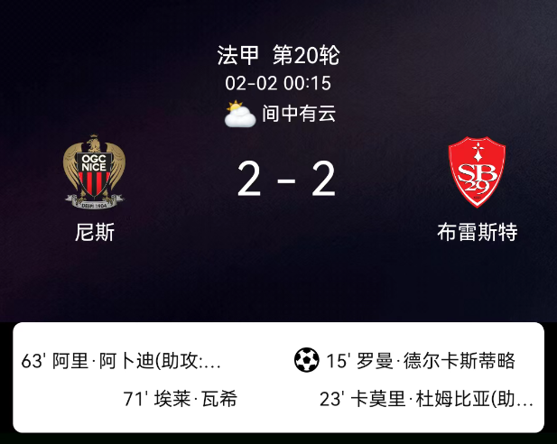 北京时间2月2日,法国足球顶级联赛第20轮,尼斯主场对阵布雷斯特。第15分钟德尔卡斯蒂略点射0-1;第23分钟敦比亚破门0-2;第63分钟阿卜迪破门1-2;第71分钟瓦希破门2-2;双方无红黄牌。最终比分,尼斯2-2布雷斯特。