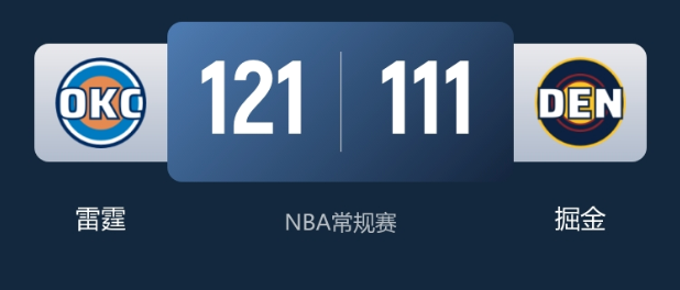 掘金(33-17,主场落败):沃特森29分5板3助、约基奇16分7板8助、穆雷12分5板12助,穆雷16中4手感低迷,全队虽多次追分但难挡雷霆外线攻势,遗憾落败。
