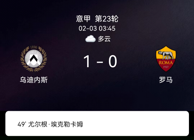 北京时间2月3日,意大利足球顶级联赛第23轮,乌迪内斯主场对阵罗马。第49分钟埃克伦坎普破门1-0;双方无红黄牌。最终比分,乌迪内斯1-0罗马。