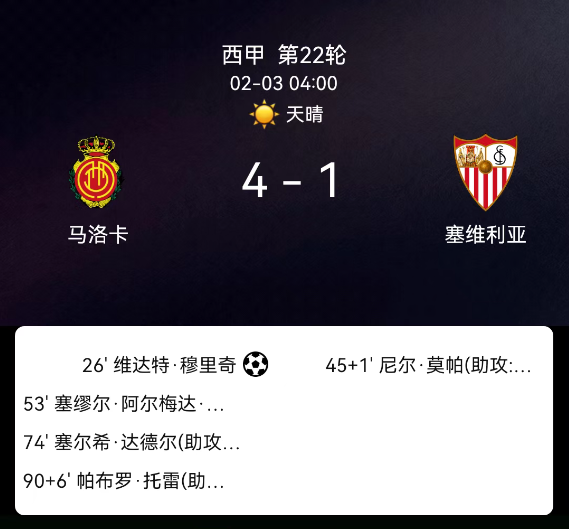 北京时间2月3日,西班牙足球甲级联赛第22轮,马略卡主场对阵塞维利亚。第26分钟穆里奇点射1-0;补时1分钟莫派破门1-1;第53分钟科斯塔破门2-1;第74分钟达德尔破门3-1;补时6分钟托雷破门4-1;双方无红黄牌。最终比分,马略卡4-1塞维利亚。