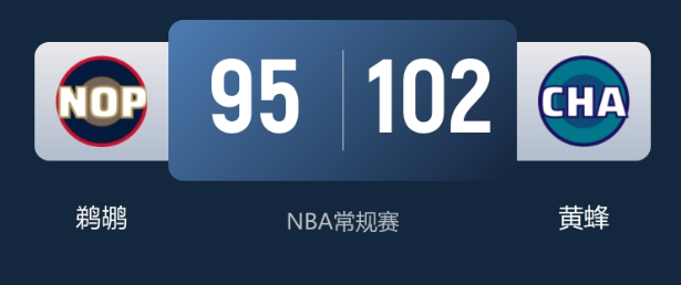 2月3日NBA常规赛黄蜂主场迎战鹈鹕,黄蜂半场落后后下半场发力逆转,最终102-95击败鹈鹕,豪取七连胜,战绩更新为23-28,鹈鹕则跌至13-39。