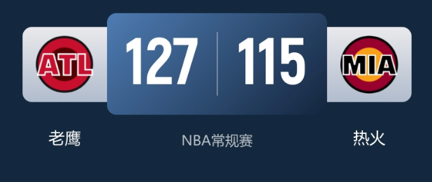 2月4日NBA常规赛热火迎战老鹰,多人缺战,老鹰全程把控优势顶住反扑,最终轻取热火终结两连败,战绩更新为25-27,热火则跌至27-25。