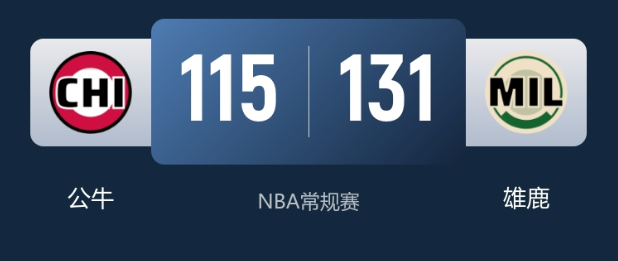 末节决战,雄鹿全程牢牢把控比赛节奏,始终保持大比分领先,公牛进攻端难有起色,未能再获得任何追分和反扑的机会,比赛早早失去悬念,雄鹿最终顺利拿下大胜终结五连败。