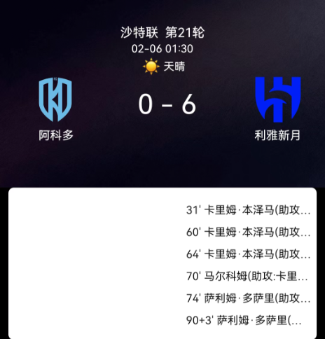 北京时间2月6日沙特联第21轮,阿科多对阵利雅得新月。第31分钟本泽马破门0-1;第60分钟本泽马破门0-2;第64分钟本泽马破门0-3;第70分钟马尔科姆破门0-4;第74分钟达瓦萨里破门0-5;补时3分钟达瓦萨里破门0-6;双方无红黄牌。最终比分,阿科多0-6利雅得新月。