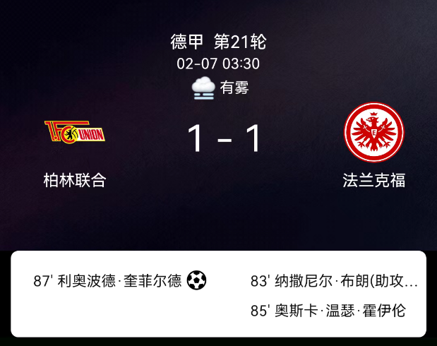 北京时间2月7日德甲第21轮,柏林联合对阵法兰克福。第25分钟卡利穆恩多黄牌;第68分钟舍费尔黄牌;第84分钟布朗破门0-1;第85分钟霍伊伦红牌+送点;第87分钟克尔费尔德点射1-1。最终比分,柏林联合1-1法兰克福。