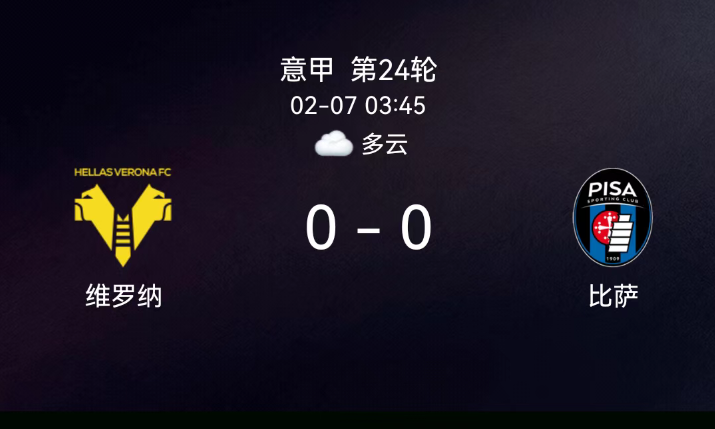 北京时间2月7日意甲第24轮,维罗纳对阵比萨。全场无进球、无红黄牌,卡拉乔洛错失得分良机。最终比分,维罗纳0-0比萨。