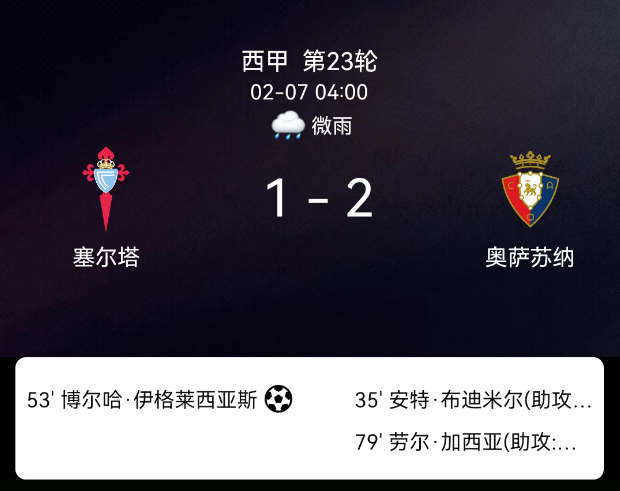 北京时间2月7日西甲第23轮,塞尔塔对阵奥萨苏纳。第35分钟布季米尔破门0-1;第53分钟伊格莱西亚斯点射1-1;第79分钟劳尔-加西亚破门1-2;双方无红黄牌。最终比分,塞尔塔1-2奥萨苏纳。